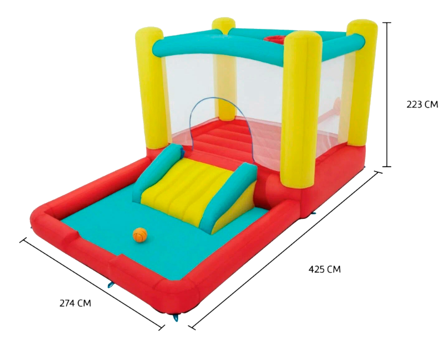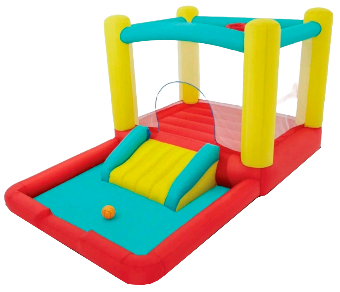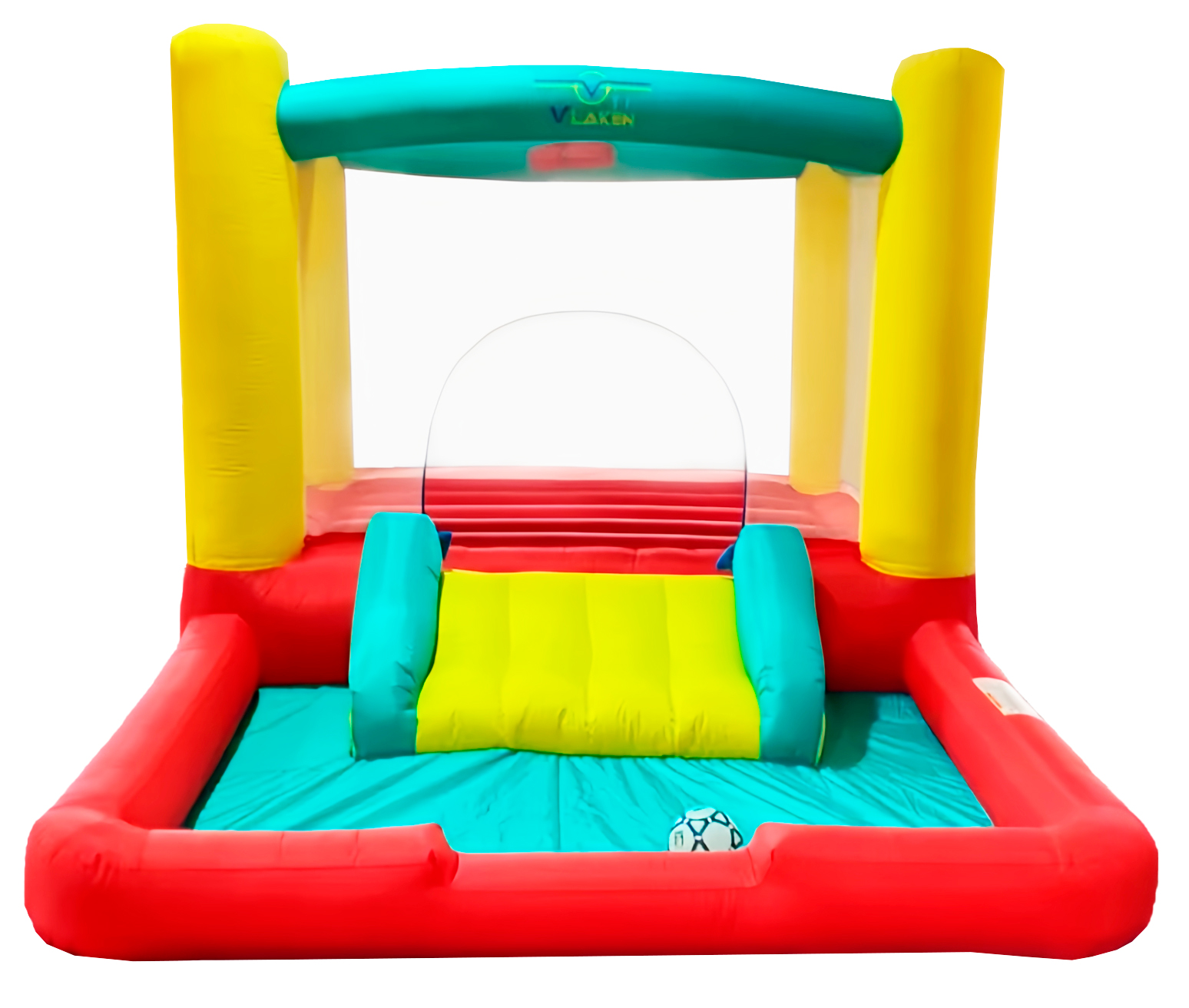 Vlaken YM1982-1 Red/Yellow/Green - это надувной батут с горкой и баскетбольным кольцом, безопасный и увлекательный аттракцион для детей от 3х лет, развивающий координацию, ловкость и физическую активность. Подходит как для активных игр и развлечения детей как на улице, так и для использования дома, в квартире. Габариты батута 425x274x223 см предоставляет достаточно пространства для игры двух детей в возрасте от 3 до 6 лет, он выдерживает максимальную нагрузку в 100 кг. Батут оборудован горкой и четырьмя башенками по углам, безопасность обеспечивают мягкие надувные бортики и высокая защитная сетка, предотвращающая выпадение во время прыжков. Батут изготовлен из прочной ламинированной ткани Оксфорд с ПВХ покрытием, что гарантирует безопасность и долговечность. Батут надувается за 2 минуты электрическим насосом, кроме него в комплект входят колышки для крепления к земле. ремкомплект и мяч.