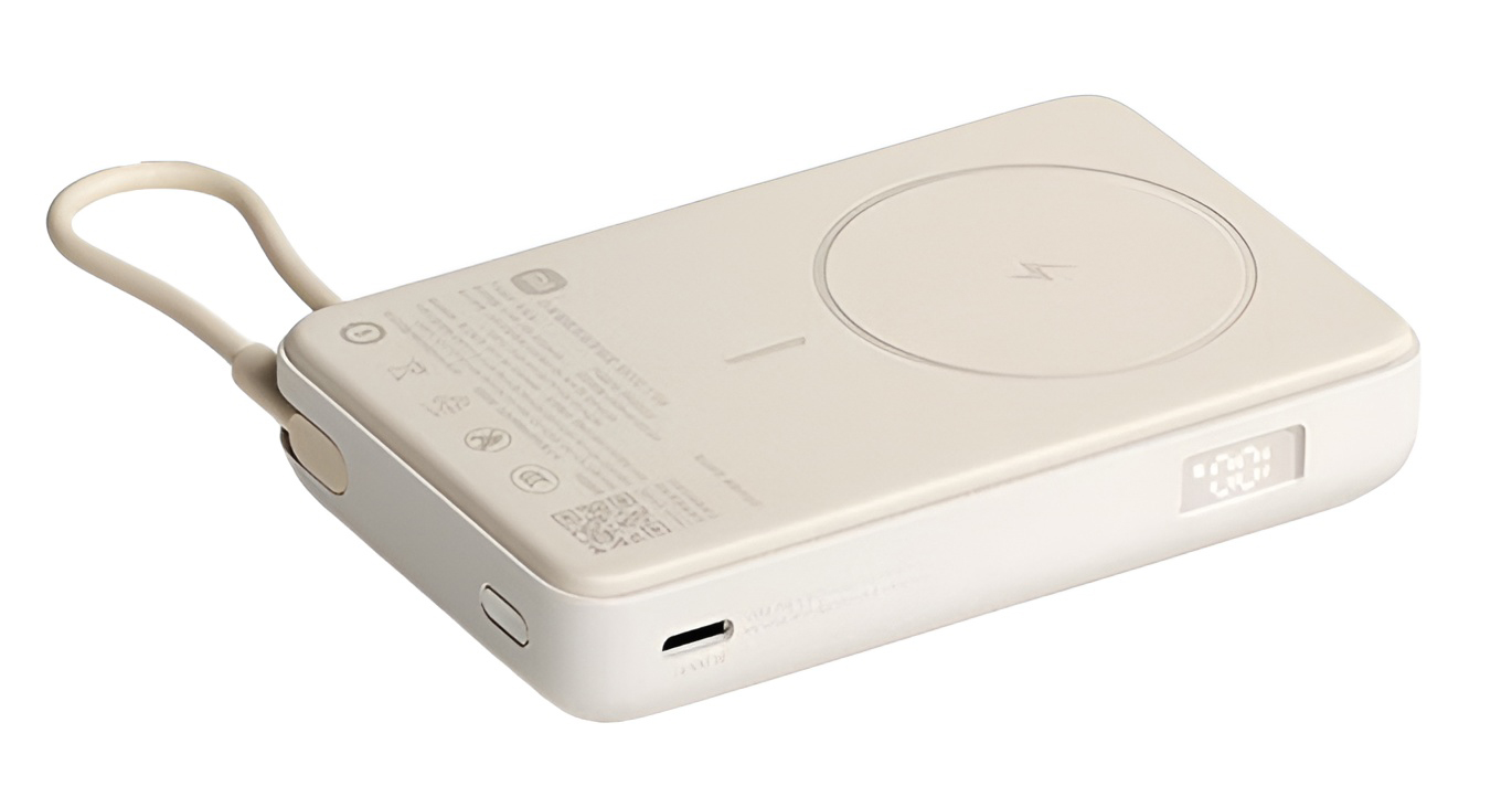 Xiaomi Magnetic Stand Power Bank 10000 mAh (WPB1007Z) Light Brown – это внешний аккумулятор, с функцией магнитно-беспроводной зарядки, с регулируемой подставкой и дисплеем. Устройство оснащено тремя независимыми выходами: магнитной беспроводной зарядкой мощностью до 15 Вт, встроенным коротким USB-C кабелем с L-образным штекером, который также служит ручкой для переноски, и дополнительным портом USB-C. Это позволяет одновременно заряжать три устройства — например, смартфон по воздуху, наушники через кабель и ещё один гаджет через порт. Внутри установлены две встроенные батареи по 5000 мАч, что эквивалентно общей ёмкости в 10000 мАч. Максимальная выходная мощность по кабелю достигает 33 Вт. Корпус выполнен в пастельном светло-бежевом цвете из матового пластика, на котором не остаются отпечатки пальцев, а на боковой стороне размещён цифровой LED-экран, отображающий точный процент остатка заряда вместо светодиодов. Встроенная металлическая подставка с регулируемым углом наклона, позволяет использовать смартфон в вертикальном или горизонтальном положении во время зарядки, будь то видеозвонок, просмотр фильма. Размеры оптимальны для размещения на задней панели смартфона без ощутимого дискомфорта.