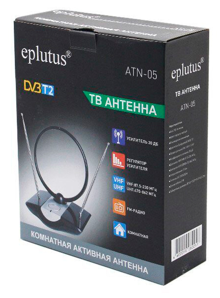 Eplutus ATN-05 - активная комнатная ТВ антенна Eplutus ATN-05 позволяет эффективно принимать эфирные сигналы метрового и ДМ диапазонов, передаваемые в современном цифровом стандарте DVB-T2, с дальнейшим воспроизведением HD изображений на экранах телевизоров последних поколений. При подключению к FM радиоприемнику устройство также обеспечивает качественное прослушивание программ удаленных станций. Антенна имеет оригинальное внешнее оформление, которое в сочетании с компактной конструкцией делает ее привлекательным интерьерным элементом, пригодным для использования даже в небольших помещениях на удалении не более 2 м от телевизора. Устройство оборудовано встроенным антенным усилителем с максимальным коэффициентом усиления 30 дБ и вынесенным на лицевую панель регулятором. Для подачи электропитания антенну достаточно включить в бытовую розетку.