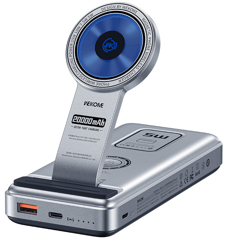 Wekome Wireless Fast Charging 5-in-1 Power Bank 20000mAh (WP-37) Silvery - это беспроводное зарядное устройство 5 в 1 подходит для всех телефонов с поддержкой технологии QI. Переносной аксессуар позволяет быстро зарядить одновременно телефон наушники и смарт часы, просто положив их на станцию без подключения кабелей блоков и проводов. Зарядный блок совместим со смартфонами, имеющими встроенную беспроводную функцию. Держатель для телефона поддерживает зарядку телефона в чехле (толщиной до 3 мм). В чехле должны отсутствовать металлические предметы, магнитные элементы, кредитные карты, иначе телефон заряжаться не будет.