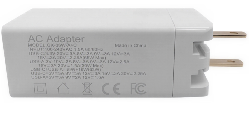 Ultra Small Fast Charger with GaN Tech (GK-65W - A+C) – это сетевое зарядное устройство с суммарной мощностью зарядки до 65 Вт. В комплекте идет переходник для евророзеток. Входное напряжение достигает до 240 В. Имеет 1 разъем USB-A и 1 разъем Type-C на блоке зарядного устройства. Оно обеспечивает быструю и эффективную зарядку смартфонов, планшетов и других гаджетов. Корпус сделан из качественного, огнеупорного ABS-пластика, не имеет постороннего запаха и презентабельно выглядит.