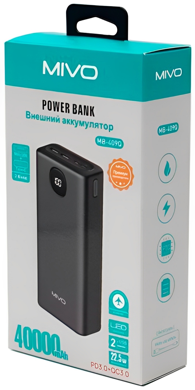 Mivo MB-409Q – это внешний аккумулятор, который предназначен для длительного автономного использования, подходит для путешествий, походов, поездок и других ситуаций. Ёмкость аккумулятора — 40 000 мАч, мощность — 22,5 W. Есть два USB-выхода для одновременной зарядки устройств. Аккумулятор оснащён LCD-экраном, который отображает процентную ёмкость заряда и рабочий статус. Есть SMART-чип для эффективного заряда. Корпус выполнен из ABS-пластика, цвет — чёрный. Размеры аккумулятора — 210 x 70 x 29 мм, вес — 815 г. Аккумулятор совместим с большинством цифровых устройств, включая iPhone, Android-устройства, iPod, КПК и Bluetooth-гарнитуры. Есть разнообразные меры защиты от короткого замыкания. В комплектацию входят зарядный кабель и упаковка/инструкция.