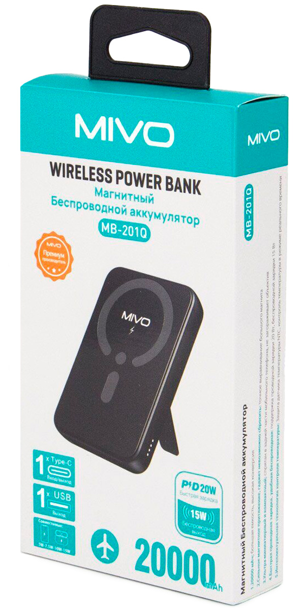 Mivo MB-201Q – это устройство для быстрой зарядки мобильных устройств с функцией беспроводной зарядки и без неё. Ёмкость аккумулятора — 20 000 мАч, мощность проводной зарядки — 20 Вт, беспроводной — 15 Вт. Аккумулятор оснащён разъёмами USB-выход и Type-C вход/выход, кабель зарядки входит в комплект. Устройство удерживается за счёт сильного магнитного притяжения. Интеллектуальная технология контроля температуры защищает аккумулятор. Аккумулятор компактный и лёгкий, имеет встроенный индикатор заряда. Совместим со многими устройствами. Оснащён SMART-чипом для эффективного заряда. Корпус выполнен из ABS-пластика. Рабочая температура аккумулятора — от –20 °С до +50 °С.