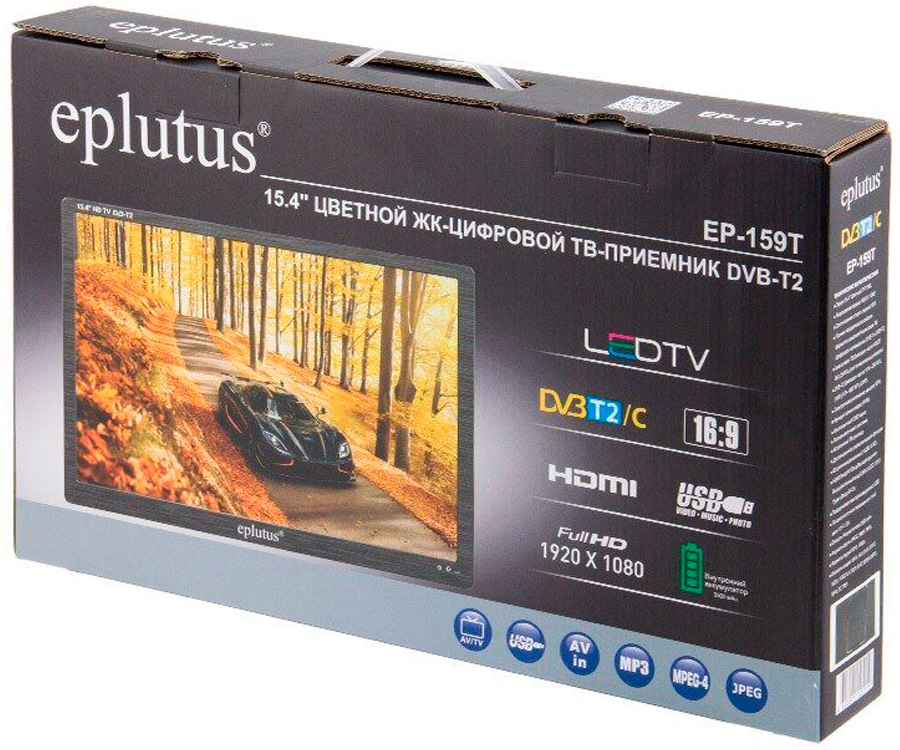 Eplutus 15.4" LED TV EP-159T – это портативный телевизор, который позволяет просматривать телепередачи как в аналоговом стандарте, так и в цифровом DVB-T и DVB-T2/C. Он формирует качественное цветное изображение с разрешением 1920х1080. Благодаря адаптерам питания 220В, 12В и собственной аккумуляторной батарее ёмкостью 3500 мАч телевизор подходит для использования в автомобилях, дачных коттеджах, малоразмерных помещениях и в путешествиях вне населённых пунктов. За счёт пары встроенных 2-ватных динамиков обеспечивается звук со стереофоническим эффектом. Штатный разъём USB помогает без добавочных устройств воспроизводить на экране телевизора аудио-, фото- и видео файлы со съёмных цифровых носителей типа карт SD и USB. При наличии дополнительного приспособления приёмник может закрепляться на стене помещения.