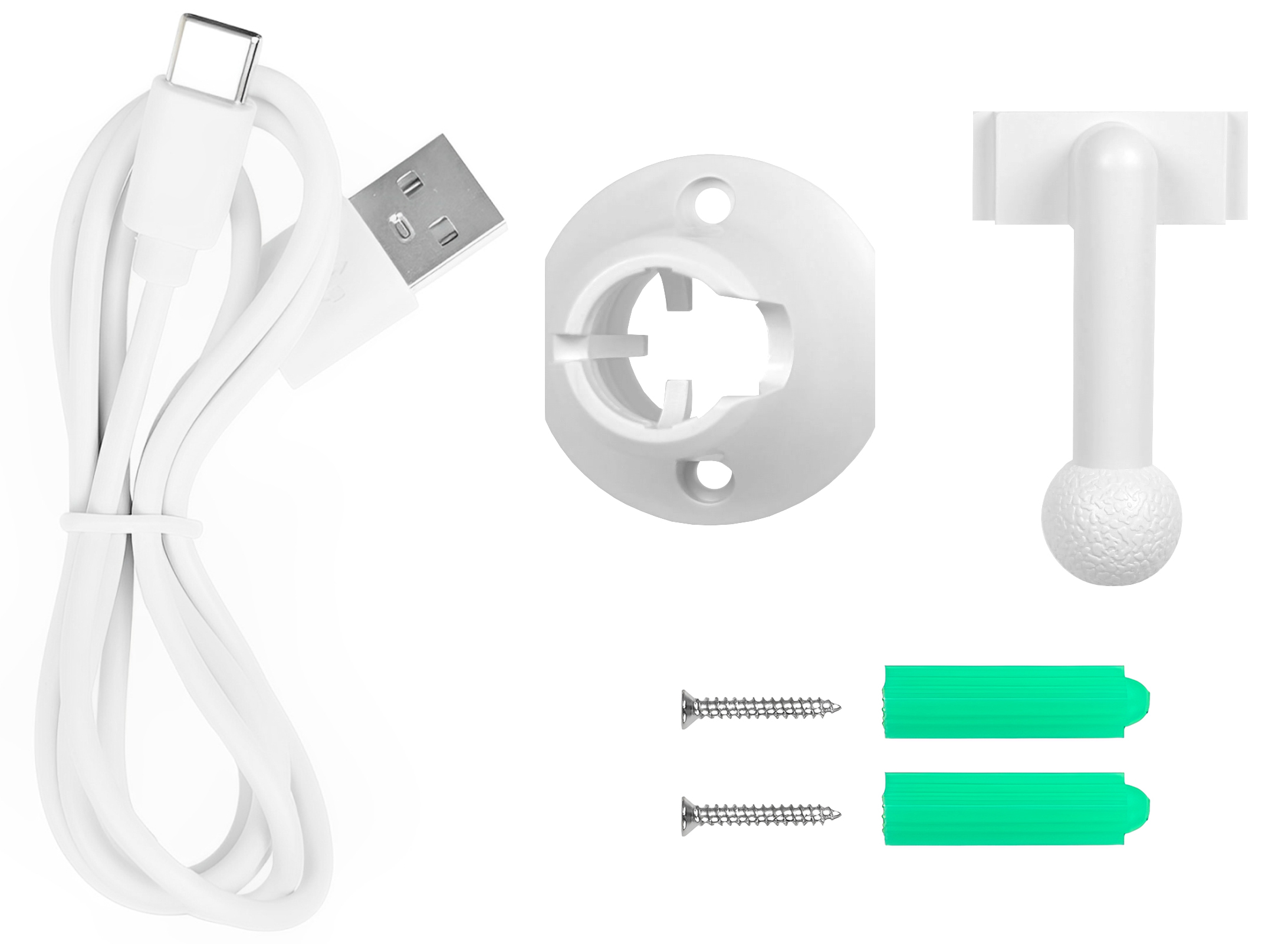 Датчик движения, Подставка, Комплект для монтажа, Кабель питания Type-C, Руководство пользователя |