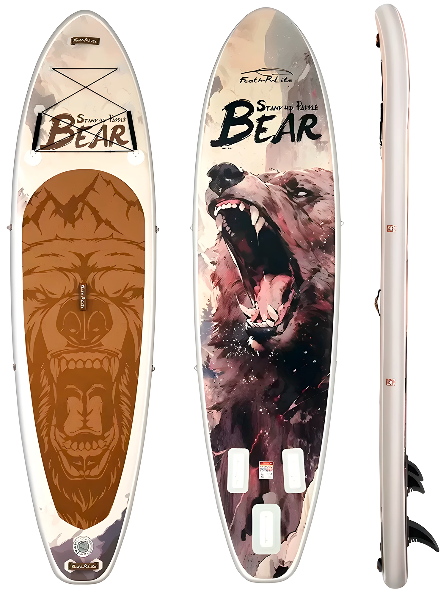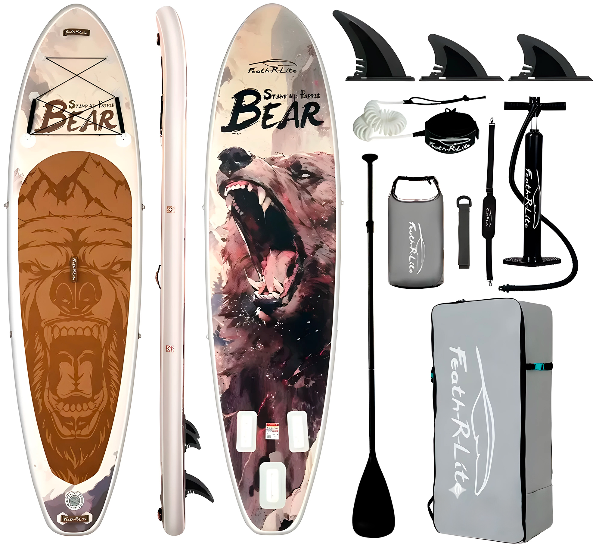 Feath-R-Lite Bear Inflatable SUP Board 350*90*15 (SUPFR19H) – сап-доска, которая выполнена из высококачественного 2-слойного ПВХ, спаянного по технологии MSL и дополнительно усиленного специальными кантами, обеспечивающими ее жесткость даже при максимальной нагрузке до 200 килограмм. При этом собственный вес доски составляет всего 8,7 кг, что делает ее легкой и удобной в транспортировке. С SUP-доской длиной 350 см и шириной 90 см гарантирована максимальная устойчивость и безопасность, что делает ее идеальным выбором как для начинающих, так и для опытных райдеров. В носовой части имеется карго-система для надежного хранения багажа и аксессуаров, в центре корпуса есть прочная и удобная ручка для переноски доски, а в хвостовой части 3 съемных плавника для большей устойчивости. В комплект поставки входит сам сапборд, 3 съемных плавника, сборное весло, насос, рюкзак для переноски, страховочный лиш, ремкомплект, водонепроницаемый чехол для телефона.