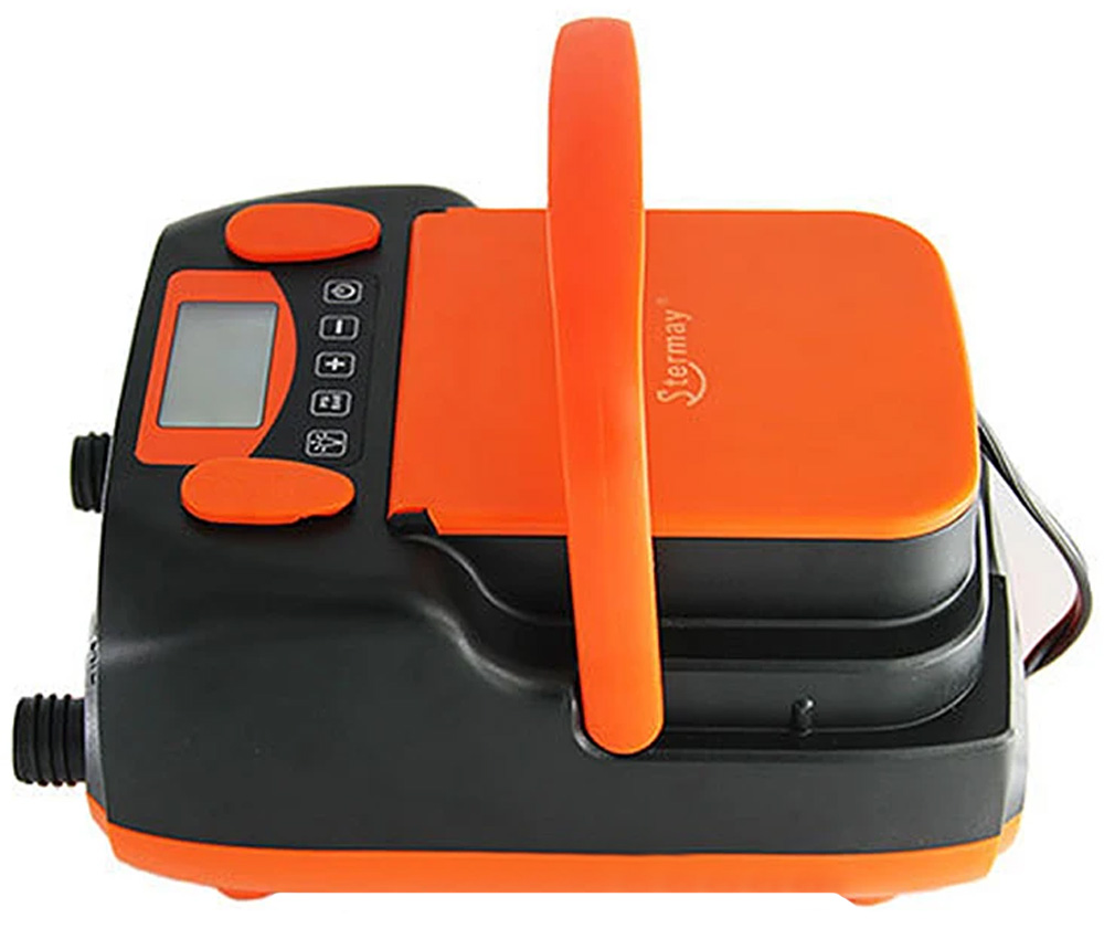 Stermay SUP Electric Air Pump (HT-790) – это аккумуляторный электрический двухступенчатый насос с мощностью накачивания 16 PSI, который предназначен для лодок ПВХ, SUP-бордов, надувных бассейнов и матрасов. Две ступени накачки: в зависимости от вида изделия, можно выбрать скорость накачки 70 или 350 литров в минуту. На накачку ПВХ-лодки уходит около 5–15 минут. Компрессор может работать в обратном режиме, откачивая воздух. Его удобно использовать там, где нужно сдувать изделие после использования. Цифровой регулятор давления позволяет задать необходимое давление с точностью до 0,034 атм. Значение меняется кнопками «+» и «-». Нет необходимости следить за процессом — воздушный насос автоматически отключится, когда давление достигнет заданной величины. Благодаря аккумулятору 6000 мА/ч и возможности заряжать его от прикуривателя 12v, насос часто используют как рыболовный и туристический. Также насос можно подзаряжать от сети, адаптер в комплекте. Для зарядки смартфона и других мобильных устройств предусмотрены два USB-разъёма 1А и 2А. Компактный электрический насос можно использовать как фонарь, яркая встроенная LED-подсветка позволяет работать даже в темноте. Насос удобен в транспортировке, не занимает много места, имеет компактные размеры. Кабель питания от прикуривателя 12в спрятан в корпус, складная ручка не выступает и не мешается, в комплекте надёжная сумка-чехол на молнии.