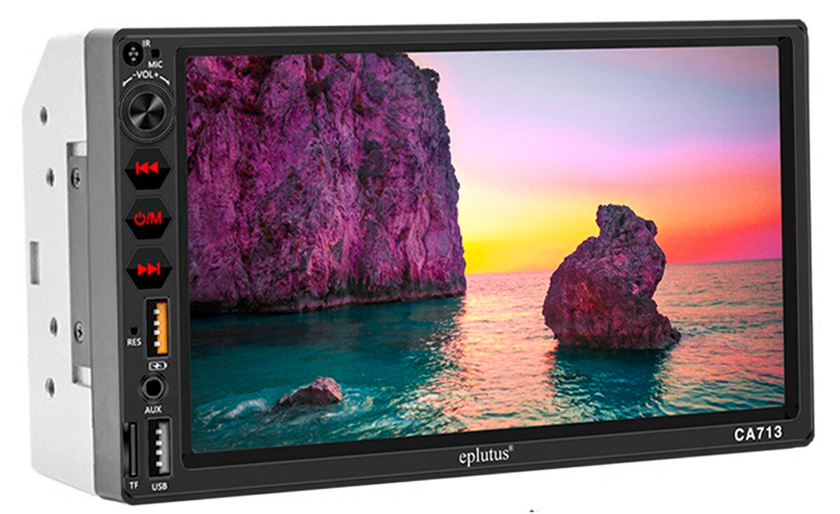 Eplutus CA713 - эта автомагнитола имеет широкий цветной экран и подходит не только для проигрывания треков, но и для просмотра фильмов, музыкальных клипов, изображений. Благодаря универсальному штатному типоразмеру 2 din ее можно установить в легковом, пассажирском или грузовом транспорте. Есть возможность подключения камер, благодаря чему увеличивается обзор, особенно сзади, и повышается безопасность.