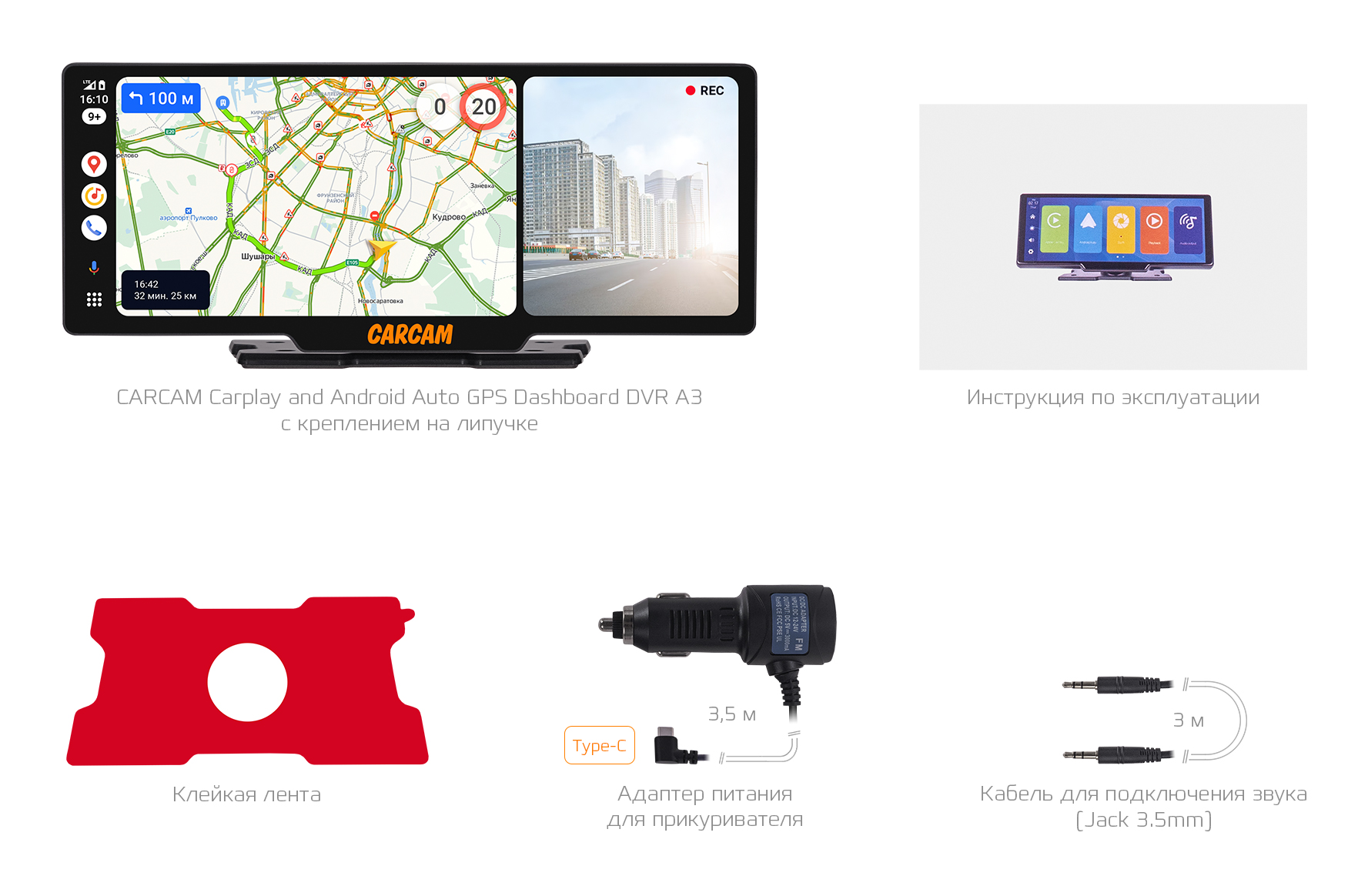 CARCAM Carplay and Android Auto GPS Dashboard DVR A3 - видеорегистратор для автомобиля с беспроводным подключением к Carplay и Android Auto. Видеорегистратор можно заряжать через прикуриватель и подключить к камере заднего вида, что делает установку и использование устройства проще и удобнее. 10,26-дюймовый сенсорный экран высокой чёткости обеспечивает ясное и широкое отображение. Вы можете использовать голосовое управление Carplay и Android Auto для управления музыкой, навигацией и другими функциями. Вы также можете передавать звук плеера на автомобильную аудиосистему, регулируя диапазон частот FM плеера и автомобильного радио. Видеорегистратор поддерживает функцию ночной съёмки. При её включении повышается яркость и контрастность записываемого видео.