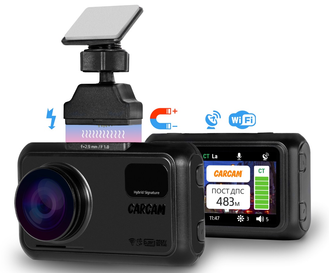 CARCAM HYBRID 2 Signature — новое многофункциональное устройство, которое объединяет в себе Quad HD видеорегистратор, сигнатурный радар-детектор и SpeedCam информер. Стеклянный 6-линзовый объектив с углом обзора 170° позволяет зафиксировать на видео не только проезжую часть, но и прилегающие к ней тротуары. Сигнатурный радар-детектор обладает 4 режимами работы, которые исключают ложные срабатывания как на загородных трассах, так и в черте города. Благодаря встроенному модулю Wi-Fi вы сможете удобно просматривать видео на экране смартфона, сохранять записи в память мобильного устройства, а также обновлять ПО видеорегистратора. Устройство поддерживает подключение дополнительной камеры с разрешением Full HD 1920×1080p, которая обеспечит видеофиксацию в салоне или позади автомобиля.