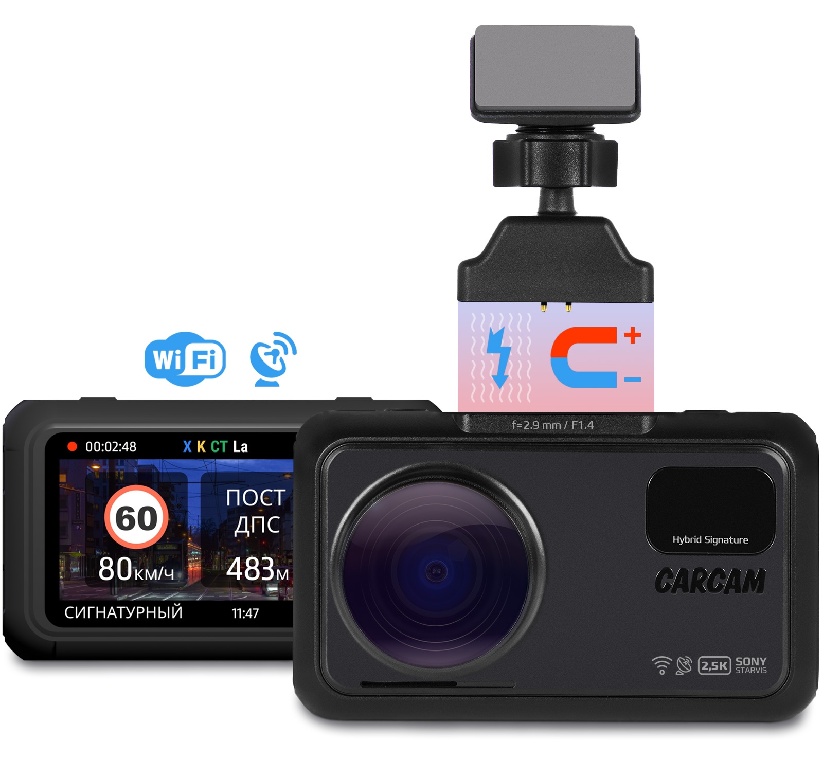 CARCAM HYBRID 3 Signature – многофункциональное устройство нового поколения, которое объединяет в себе Quad HD видеорегистратор, сигнатурный радар-детектор и SpeedCam информер. Благодаря современной 5-мегапиксельной матрице SONY STARVIS IMX 335 устройство ведет съемку в разрешении 2560×1440p, что обеспечивает высокую детализацию изображения при любых условиях освещения. Стеклянный 6-линзовый объектив с ИК-напылением обладает углом обзора 170° и позволяет зафиксировать на видео не только проезжую часть, но и прилегающие к ней пешеходные зоны. Сигнатурный радар-детектор обладает 4 режимами работы, которые исключают ложные срабатывания как на загородных трассах, так и в черте города. Встроенный модуль Wi-Fi позволяет удобно просматривать видео на экране смартфона, сохранять записи в память мобильного устройства, а также обновлять ПО видеорегистратора. Устройство поддерживает подключение дополнительной камеры с разрешением Full HD 1920×1080p, которая обеспечит видеофиксацию в салоне или позади автомобиля.