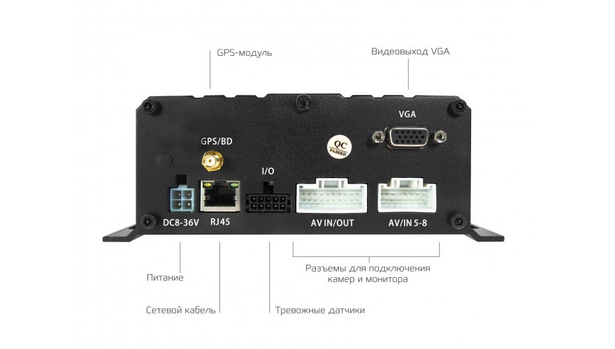 Видеорегистратор поддерживает одновременную запись видео с 8 каналов. Запись ведется в разрешении Full HD 1920x1080p, что позволяет рассмотреть на видео все подробности происходящего в салоне транспортного средства.
