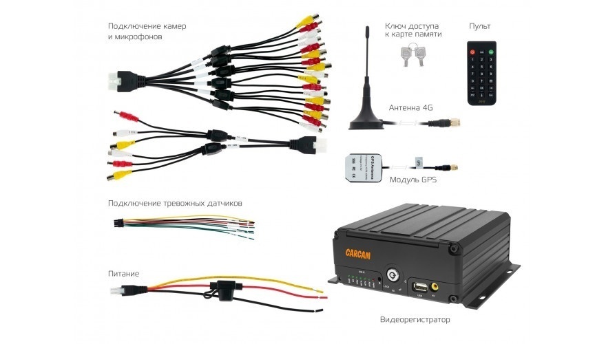Устройство поддерживает подключение микрофона, что позволяет не только видеть, но и слышать, что происходит в салоне транспортного средства. Специальный кабель BNC-RCA-DC обеспечивает удобное подключение камер и микрофона через один разъем. Вам не придётся прокладывать отдельный кабель для микрофона.