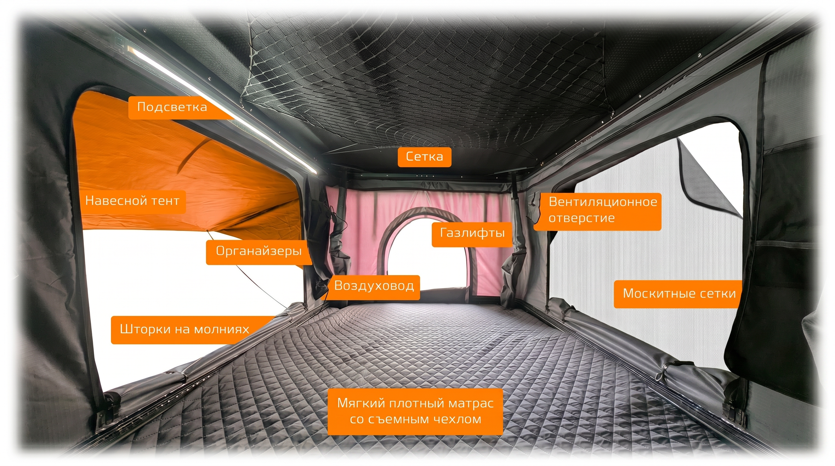 Внутри палатки находится мягкий удобный матрас ( толщина 5 см) из губчатого материала высокой плотности 30D со съемным чехлом. Также палатка оборудована встроенным освещением в виде светодиодной ленты, которая работает от внешних источников питания, для большего комфорта. Москитная сетка на окнах и дверях блокирует вход для насекомых. А также она обеспечивает циркуляцию воздуха и позволяет естественному свету попадать в шатер. Дополнительно в палатке имеются отдельные вентиляционные отверстия и воздуховод.