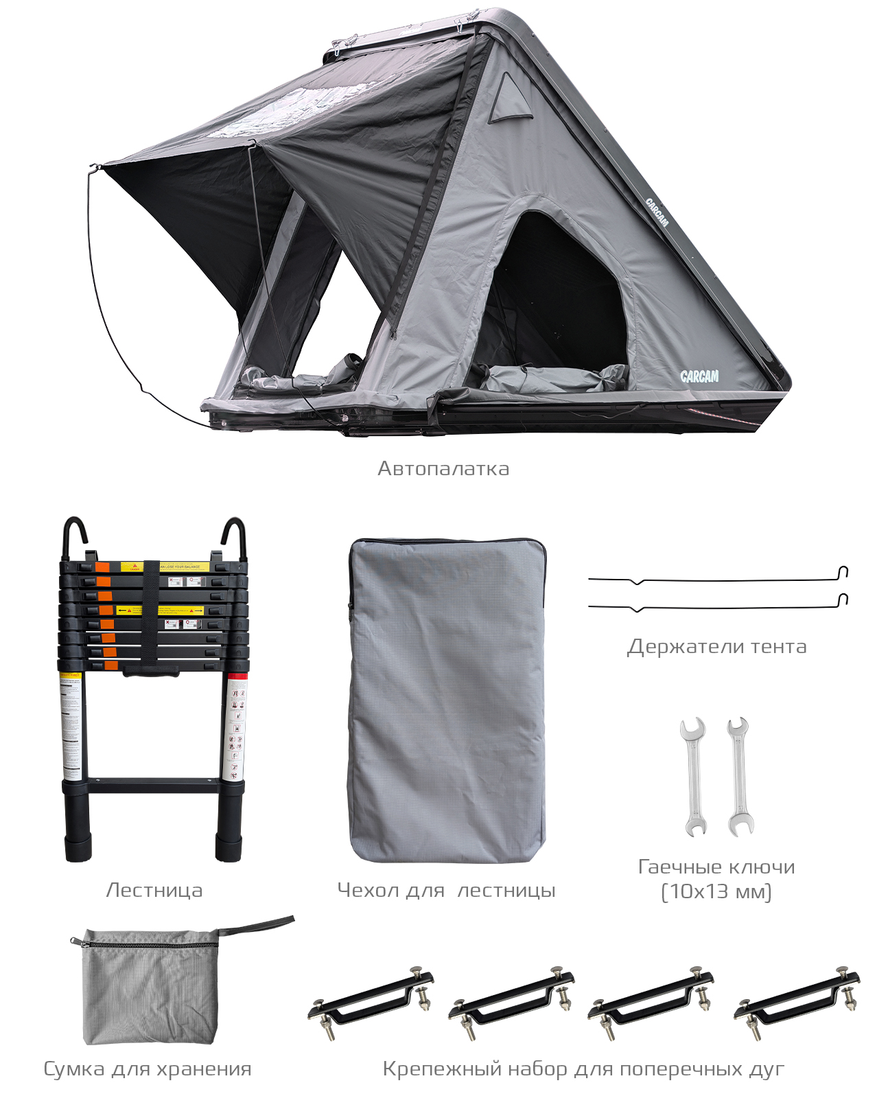 Автомобильная палатка, Раздвижная лестница, Монтажный комплект к поперечным дугам, Органайзер для вещей (2 шт.), Держатель тента (2 шт.), Гаечный ключ (2 шт.), Матрас со съемным чехлом |