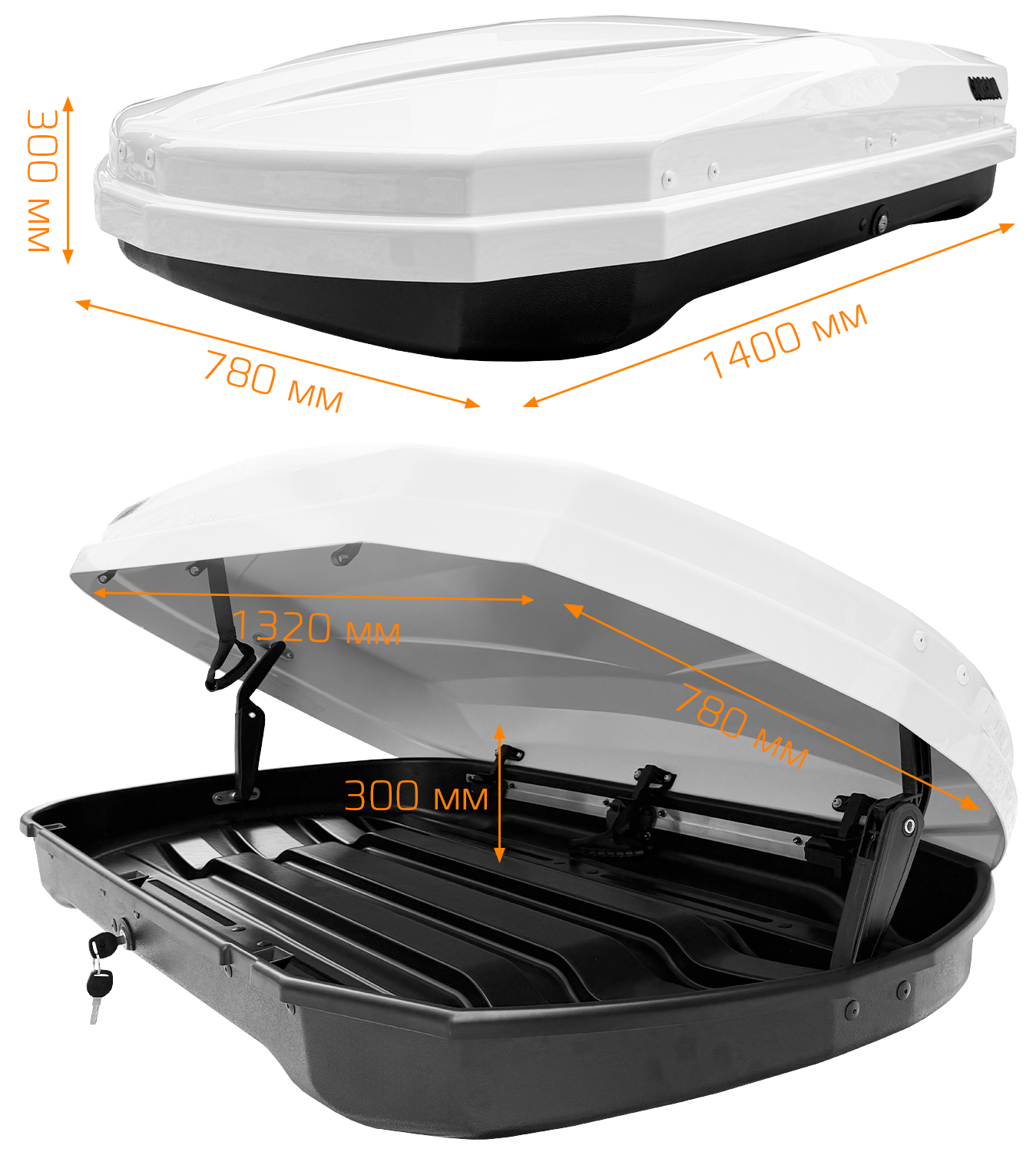 1400х780х300 мм (внешний размер); 1320х775х241 мм (внутренний размер) |