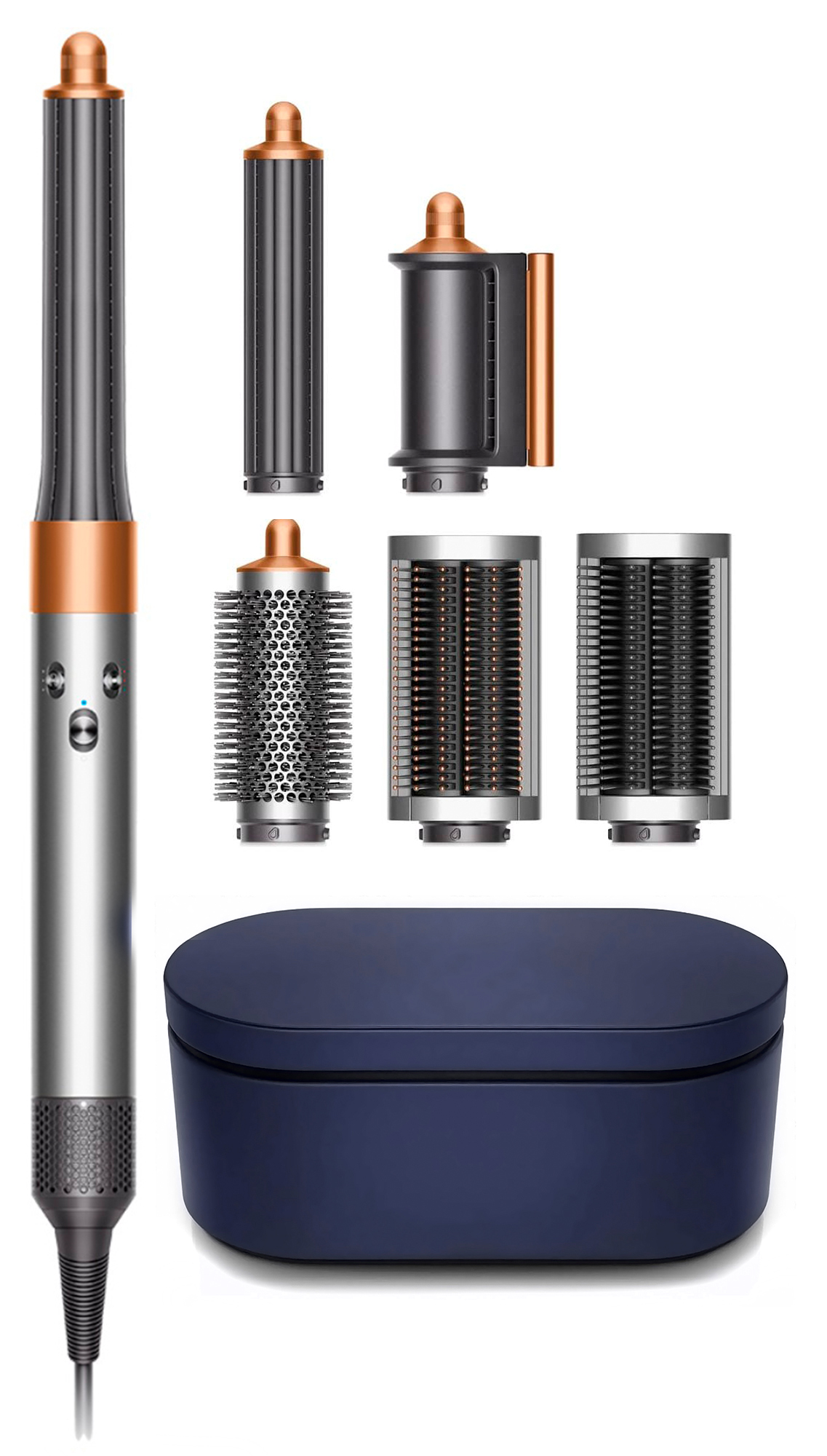 Стайлер, Цилиндрическая насадка 40 мм, Цилиндрическая насадка 30 мм, Мягкая щетка для выпрямления, Жесткая щетка для выпрямления, Круглая щетка брашинг, Насадка для предварительной сушки, Бокс-чехол темно-синего цвета, Щетка для чистки фильтра |