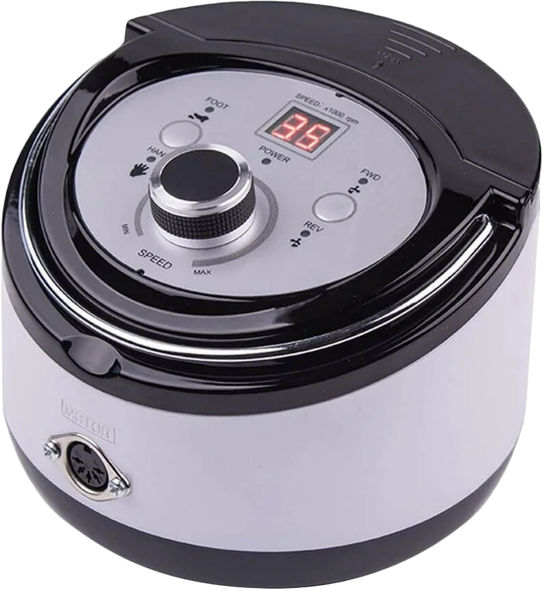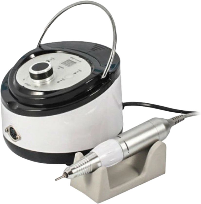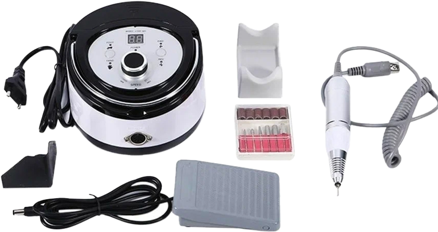 Nail Drill Set ZS-606 - фрезер для маникюра и педикюра. Аппарат мощностью 65 W и скоростью вращения до 35000 оборотов в минуту. Обладает низким шумом во время работы с минимальным уровнем вибраций. Ручка удобно лежит в руке и имеет профессиональный зажим, который позволяет быстро менять насадки. Ручка оборудована функцией самоохлаждения, что дает гарантию продолжительности в работе. Аппарат имеет цифровое управление, что позволяет останавливать вращения или реверс "на ходу" без полного отключения блока питания. Экран установленный на лицевой стороне блока управления , показывает скорость вращения фрезерной насадки. В корпусе управления есть место для хранения насадок под специальной открывающееся крышкой. Регулятор скорости находится на лицевой стороне корпуса, с помощью колесика изменяется количество оборотов в минуту. На фронтальной стороне блока находятся кнопки управления реверса, а с обратной стороны - кнопка управления для ручного или ножного. Также сзади размещен ламповый предохранитель. В аппарате установлен реверс – изменение направления вращения фрезы.