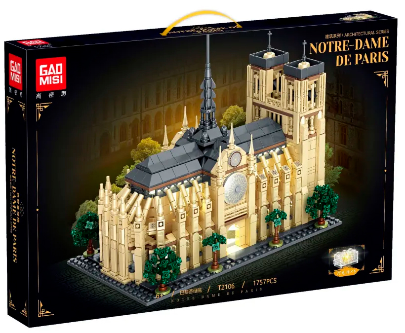 TaiGaoLe Gao Misi Notre Dame de Paris (T2106) – конструктор, копирующий Нотр-Дам-де-Пари. Общее количество деталей конструктора – 1757 штук. Сборка детализированной модели собора Парижской Богоматери увлечёт не только ребенка, но и взрослого. Детали выполнены из высококачественного пластика, который абсолютно безопасен и не выделяет вредных веществ. Особенностью набора является светильник, который можно разместить внутри. Подходит для детей от 8 лет.