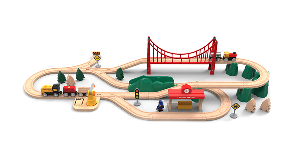 В комплект игрушки, кроме дороги и самого состава, имеются также элементы пейзажа, железнодорожная станция, погрузочный кран, регулировщик и т. д. Состав поезда собирается при помощи магнитных соединений. Управление поездом интуитивно понятно ребенку, так как запуск и остановка его осуществляется всего одной кнопкой на корпусе.