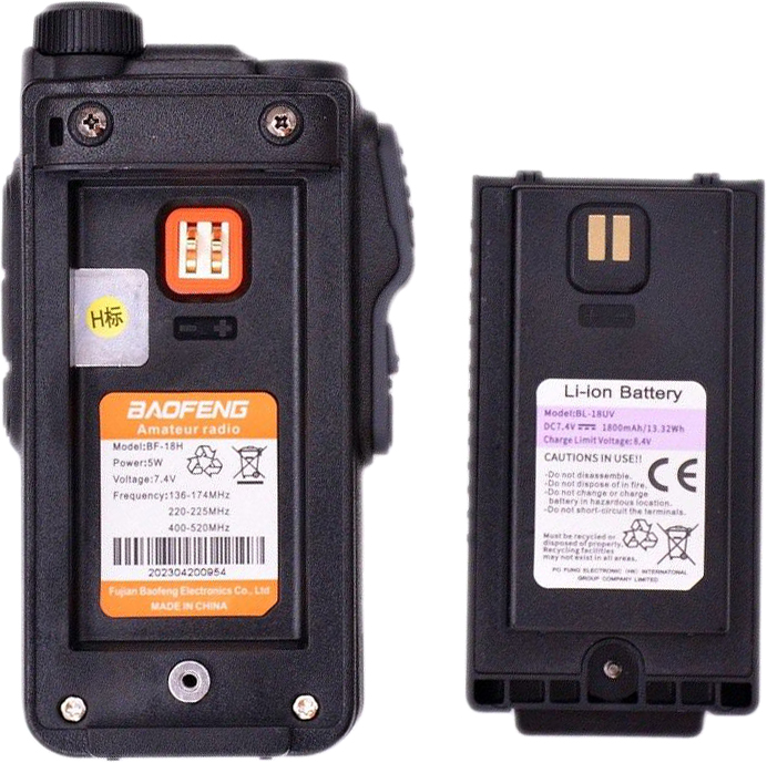Рация BAOFENG BF-18H 5W питается от литий-ионного аккумулятора 7,4 В/1800 мАч, что обеспечивает длительное время автономной работы.