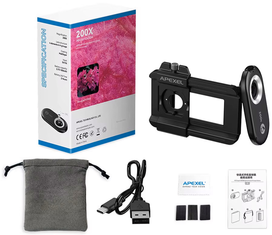 Apexel Microscope Lens (MS200) – это объектив-микроскоп для смартфона с увеличением 200X и CPL-фильтром. Линза имеет 12 ярких светодиодный огней, предлагающих 12 различных режимов, и 6 ультрафиолетовых огней, что часто применяется при проверках подлинности объектов. Зажим регулируется в большом диапазоне крепления 71-105 мм/2,8-4,1, что позволяет использовать его на смартфонах, не снимая с них чехол. Аккумулятор емкостью 100 мАч заряжается 1,5 часа и позволяет работать с микроскопом в течение 5,5 часов. Подходит для исследования растений и насекомых, масляной живописи, ювелирных изделий и т. д.