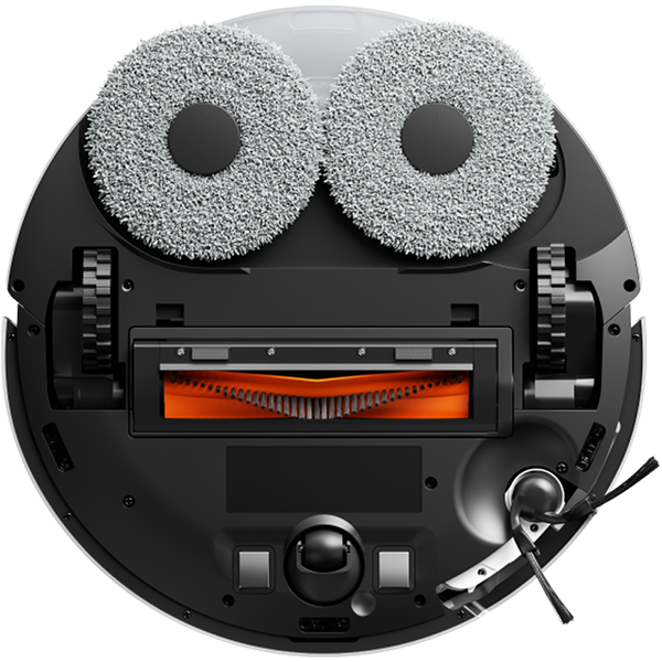 Это современный пылесос-робот в элегантном белом корпусе с оранжевыми акцентами, подчеркивающими его премиальный вид. Компактные габариты (высота всего 9,9 см) позволяют устройству легко проходить под мебелью, а круглая форма обеспечивает эффективное движение по дому и уборку в труднодоступных местах.