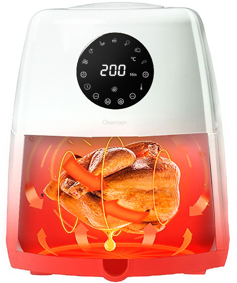 Xiaomi Onemoon Small Moon Air 3.5L (OA5) – фритюрница, с которой вы сможете пожарить картошку фри, запечь наггетсы или креветки без капли масла. Все вкусовые качества продуктов останутся на высоте. И никакого канцерогена, которое вырабатывает подгоревшее масло. Приготовление еды происходит при помощи воздуха, нагретого до необходимой температуры. Он постоянно циркулирует внутри фритюрницы, создает хрустящую корочку и сохраняет нежную консистенцию продуктов. Вы можете регулировать температуру от 80 до 200 градусов, создавать вкусные и полезные блюда для всей семьи, не тратя на готовку много времени. Управлять устройством легко при помощи сенсорного дисплея с интуитивно понятным интерфейсом. Фритюрница способна заменить несколько кухонных приборов, таких как духовка, микроволновка, тостер. Поэтому устройство будет незаменимо на любой кухне. Чаша большой емкости (3.5 л) позволяет приготовить гарнир или мясо на семью из 4-5 человек. Удобная ручка не нагревается в процессе работы и позволяет с легкостью извлечь продукты после приготовления. А встроенный таймер предупредит о готовности блюда.