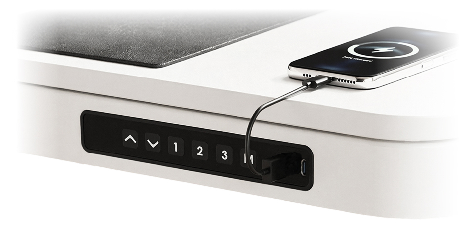 Рядом с пультом управления на боковине имеются 2 разъёма: USB-A и Type-C. Вы можете легко заряжать телефон от самого стола. Теперь не нужно тянуть провода от ближайшей розетки.
