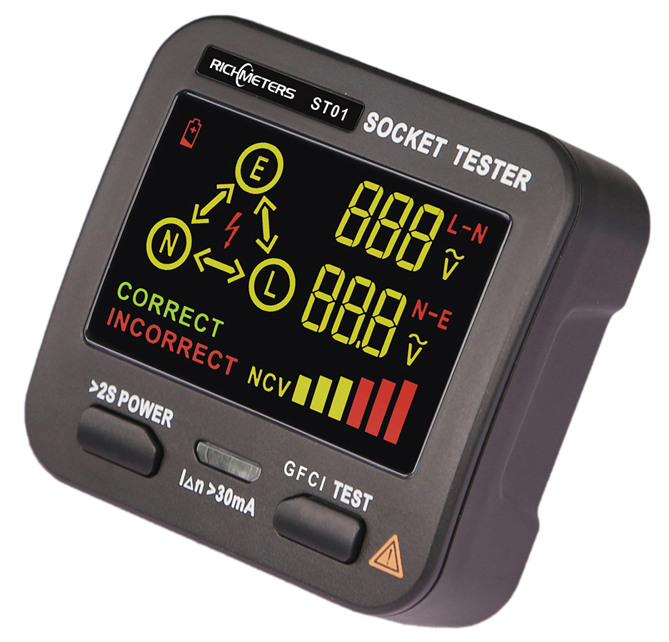 RichMeters ST01 - это профессиональное устройство для проверки подключения фазы, ноля и заземления к розетке, напряжения между проводами, наличия электрического поля. Все результаты измерений одновременно отображаются на большом ЖК-экране. Широко используется для тестирования, технического обслуживания электрооборудования, тестирования офисных розеток, удлинителей и т. д.