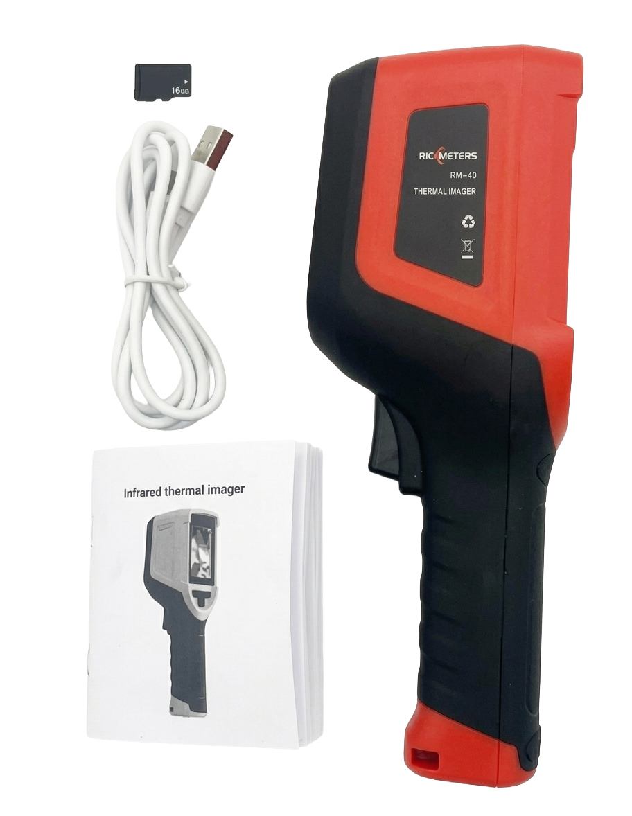 RichMeters RM-40 – это портативный тепловизор для бесконтактного измерения температуры и визуализации тепловых полей. Прибор измеряет температуру в диапазоне от –20 до +400 °C с точностью ±2 °C, с возможностью выбора единиц измерения Цельсия или Фаренгейта. Детектор с инфракрасным разрешением 120×90 пикселей при шаге пикселя 17 мкм и спектральным диапазоном 8–14 мкм, обеспечивает тепловую чувствительность NETD менее 60 мК. Угол поля зрения составляет 50° по горизонтали и 38° по вертикали, пространственное разрешение — 7,6 мрад, частота кадров — менее 25 Гц, а минимальная дистанция съёмки без необходимости фокусировки — 0,1 м. Коэффициент излучения по умолчанию установлен на 0,95 и регулируется от 0,01 до 0,99. Устройство оснащено 2,4-дюймовым TFT-дисплеем с разрешением 320×240 пикселей. Измерения отображаются на экране в виде температуры в центральной точке кадра с автоматическим отслеживанием максимума и минимума, а для визуализации доступно шесть цветовых палитр: лава, высококонтрастная радуга, чёрное тепло, белое тепло, железо красное и радуга. Изображения сохраняются на карту Micro SD (в комплекте 16 ГБ) в формате BMP, передача данных на ПК осуществляется через USB Type-C, а для анализа прилагается специальное программное обеспечение. Пользовательские тревоги по превышению или понижению температуры индицируются на экране, светодиодной подсветкой (фонариком) и звуковым сигналом. Благодаря небольшому весу, защите IP54 и ударопрочности прибор пригоден для работы в полевых условиях, на промышленных объектах и в труднодоступных местах. Питание обеспечивается перезаряжаемой литий-ионной батареей, обеспечивающей более 9 часов непрерывной работы при времени зарядки менее 2,5 часов (зарядный ток 5 В / 2 А). В комплект входят руководство пользователя, кабель USB Type-C и карта памяти Micro SD на 16 ГБ.
