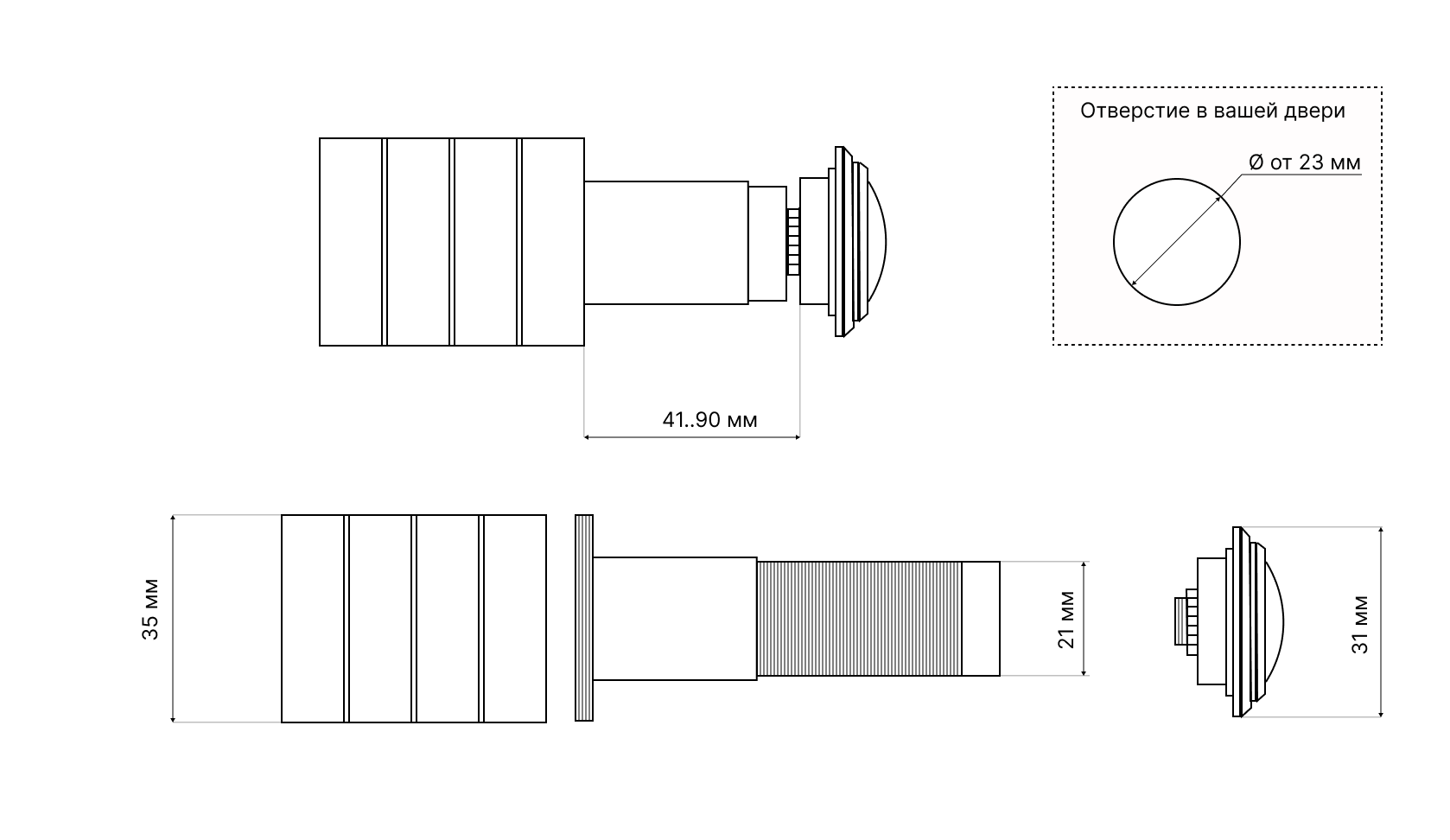 У видеоглазка изменяемая длина, он подходит для дверей 41 до 90 мм и диаметром отверстия для глазка от 23 до 32 мм.