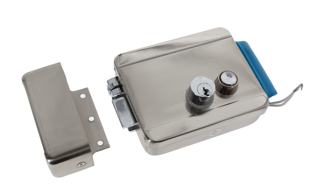 Электромеханический замок срабатывает во время кратковременной подачи напряжения. Когда напряжение отсутствует, открыть его можно либо изнутри при нажатии на механическую кнопку, либо снаружи - ключом из комплекта поставки.