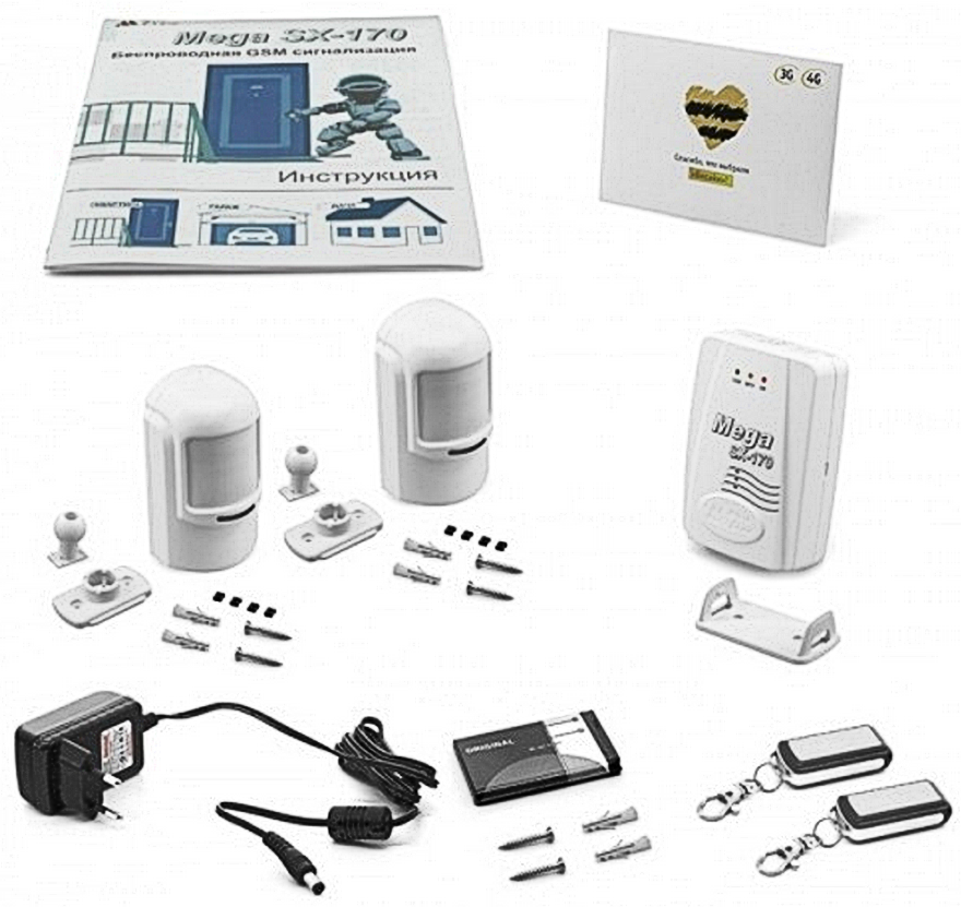 2 радиодатчика движения, 2 брелока управления, встроенный микрофон, блок питания, аккумулятор резервного питания, сим карта.