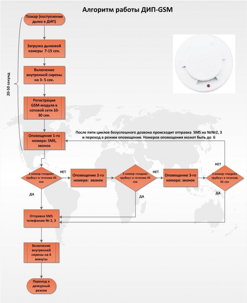 Работает круглосуточно, оснащён встроенной сиреной. Отправляет оповещение на мобильный телефон звонком и SMS (до 6-ти номеров оповещения). Устойчив к ложным срабатываниям. При обнаружении пожара любым из извещателей соедененных в группу - все извещатели группы будут производить звуковое оповещение сиреной, а ДИП GSM произведет оповещение на телефоны